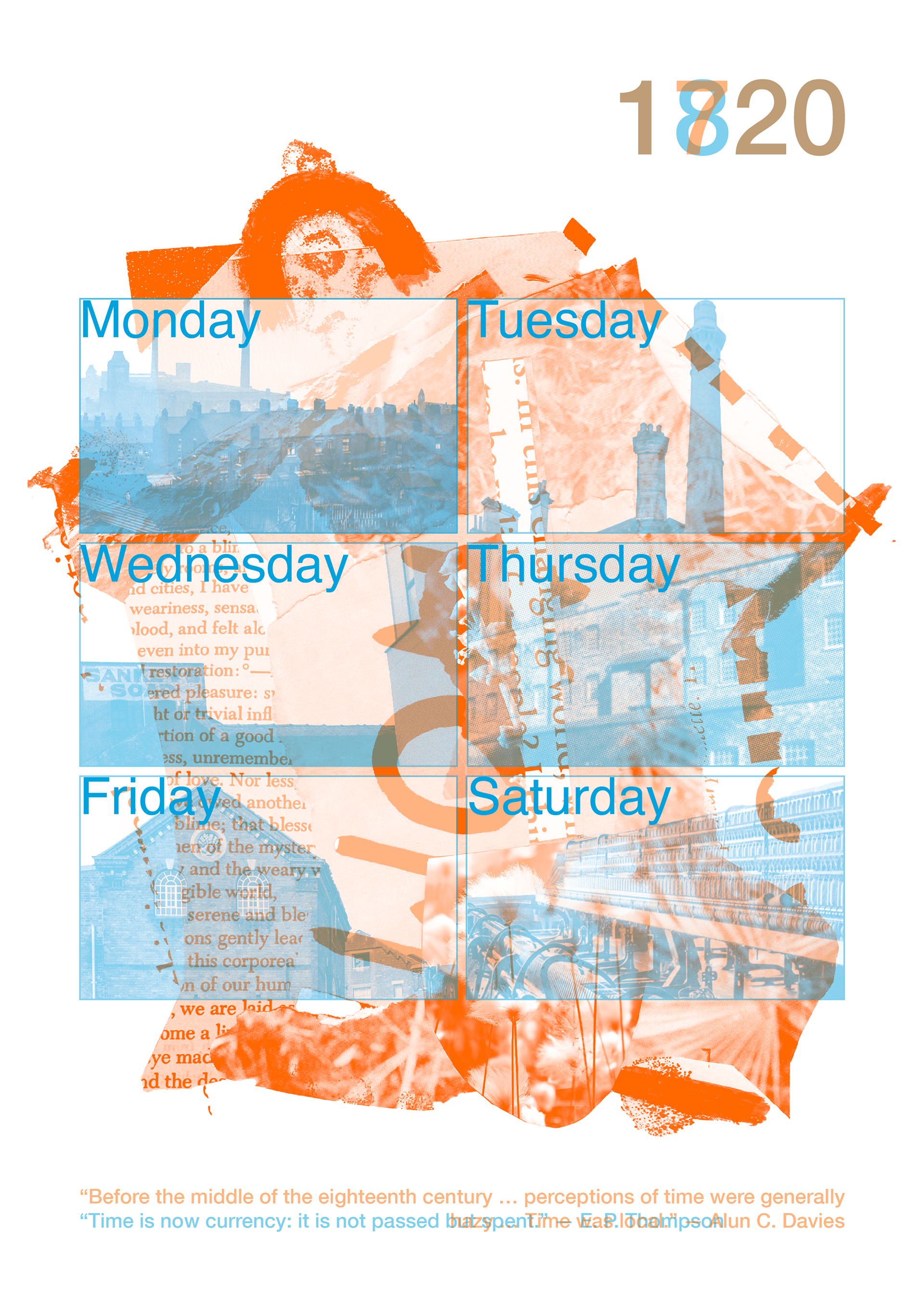 This piece mimics a calendar to show how the Industrial Revolution invented modern time. Before this, things didn’t take a ‘certain amount' of time. They just took as long as they took. Using light and a traditional design grid to create a six-day factory workweek (as was the norm), this collage moves between eras to illustrate this shift from natural rhythm to human control.